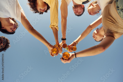 View from below of people that are cheering with beer bottles