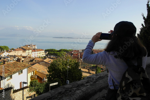 View from Desenzano del Garda castle with female tourist photographing, Lombardy, Italy