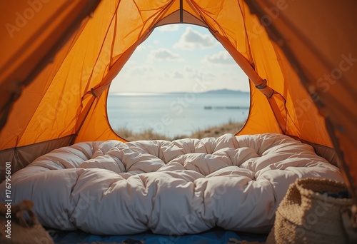 view from inside a cozy tent overlooking calm waters during a serene camping experience by the shore