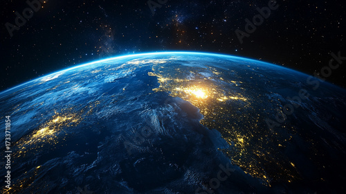 View from orbit showing planet Earth at night with glowing atmosphere city lights and cosmic space background symbolizing unity mystery and global connection.