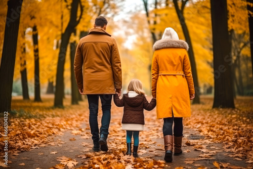 View from the back of the caucasian family walking in the park autumn fall leaves in the ground and trees