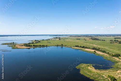 View from the drone over the lake and thickets, lake landscape.