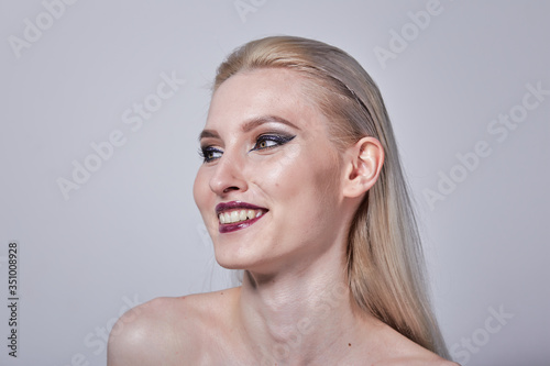View from the side of a beautiful young girl with bright makeup and a beautiful smile.