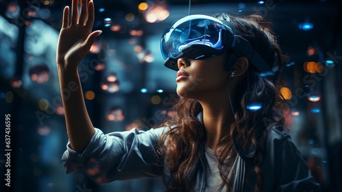 View from the side of a young woman using her hands to explore a futuristic environment while wearing virtual reality goggles..