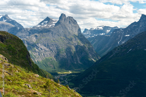 View from the top of Romsdalseggen trail in Andalsnes down to the fjords and the Rauma river with fjords in the background