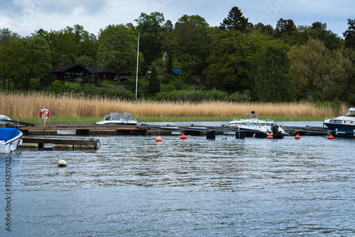 view from the water to the shore, boat moorings with boats, coastal reeds, large trees on the hilly shore, summer day