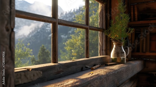 view from the window of a mountain cabin, bathed in sunlight, offering a serene and picturesque scene of nature's beauty.