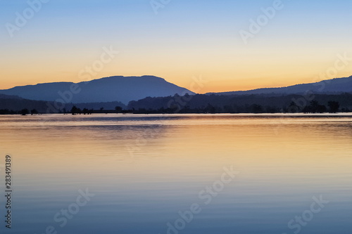 view morning of Mekong river around with the hills and orange sun light in the sky background, sunrise at Khong Chiam, Ubon Ratchathani, North-eastern of Thailand.