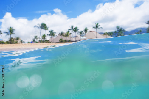 View of a Beautiful tropical island beach resort from the surface of the ocean looking back at a secluded, idyllic beach with palm trees and cabanas. focus on the surface of the water
