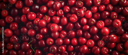 View of a bunch pile of fresh red Cherry fruits with neatly stacked leaves arranged from above on a wide flat textured background
