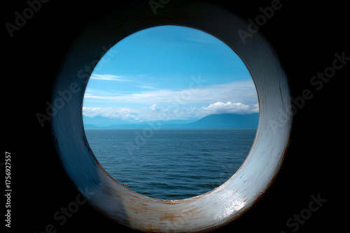 View of a calm ocean and distant mountains through a round ship porthole against a bright blue sky with scattered clouds