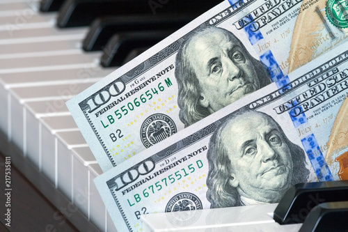 View of a fragment of two one hundred dollar banknotes, a new sample, inserted into the piano keys (concept)