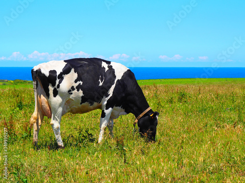 View of a Holstein Friesian cow in the green field