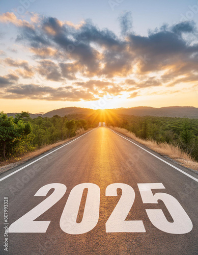 View of a landscape with a road running through it in the center reaching to the horizon. The writing 2025 on the asphalt - New Year and business concept