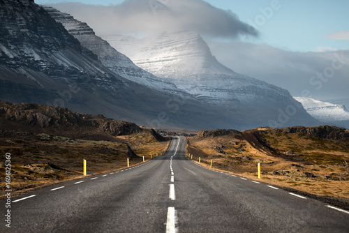 View of a long asphalt road stretches into the distance, flanked by golden fields contrasting with snow-capped mountains under a cloudy sky, Iceland.