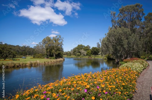 View of a park and river landscape in an urban setting