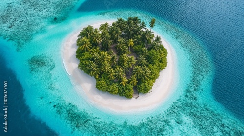 View of a peaceful island surrounded by turquoise waters, with white sandy beaches and palm trees, evoking a sense of tropical paradise.