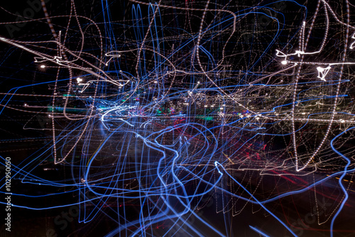 View of an abstract composition of blurry lights on street by moving or shaking camera.