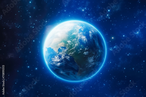 View of blue planet earth in space 3d rendering. Earth planet in deep space. Outer dark space wallpaper. Night on planet with cities lights. Surface of Earth.