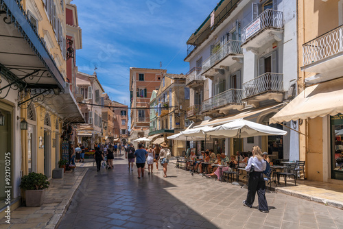 View of cafes and bars on Nikiforou Theotoki, Corfu Town, Corfu, Ionian Sea, Greek Islands, Greece