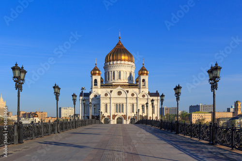 View of Cathedral of Christ the Saviour from Patriarshiy Bridge over Moskva river in sunny spring morning