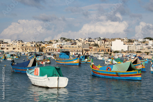 View of colorful fishing boats in Marsaxlokk harbor, Malta