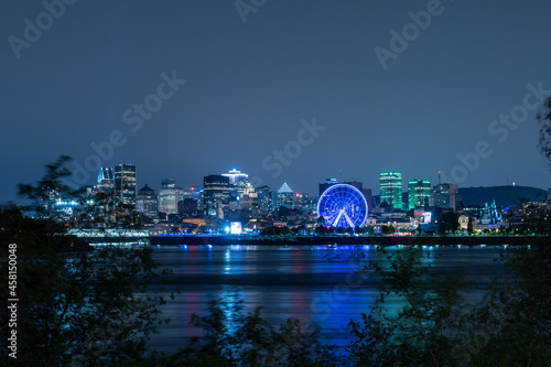 View of downtown Montreal city skyline and Saint Lawrence River at night, Quebec, Canada.