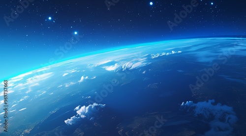 View of Earth from Space Featuring Blue Oceans and Green Landmasses with Stars in the Black Sky Above