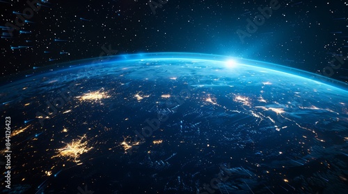 View of Earth from space with city lights and atmosphere