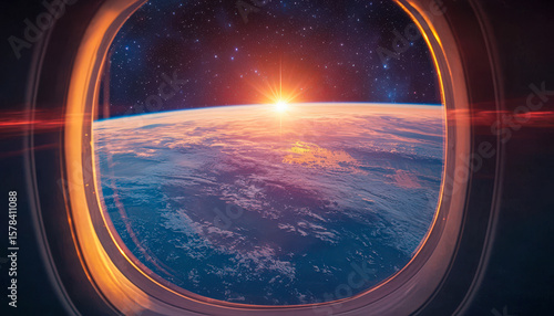 View of Earth from space with sunrise and starry background through a spacecraft window