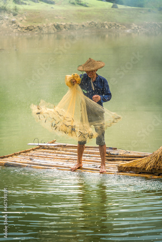view of fishermen fishing on river in Thung mountain in Tra Linh, Cao Bang province, Vietnam with lake, cloudy, nature