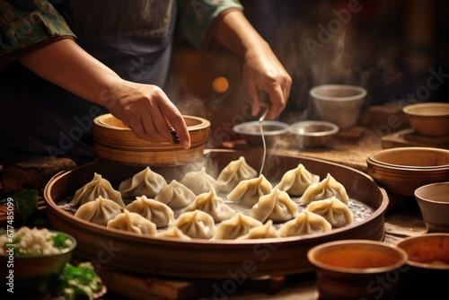 View of freshly made Chinese dumplings in the kitchen. Chinese making dumplings. Generative AI