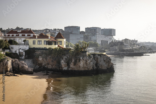 View of golden sands meet rugged cliffs, where pastel buildings contrast with modern architecture under a hazy sky, Cascais, Lisbon, Portugal.