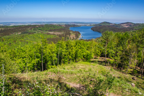 view of Granestausee reservoir and forest at Harz Mountains National Park, Germany