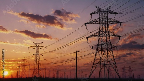 view of high voltage power lines at sunset. generative ai