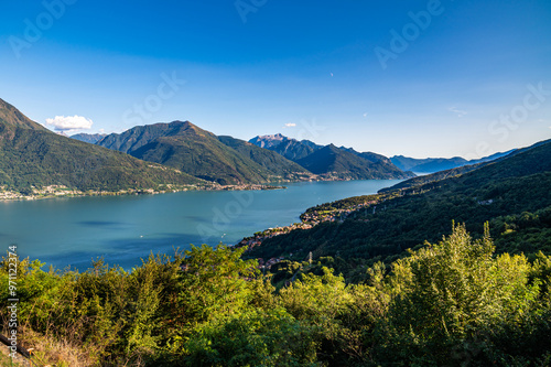 View of Lake Como, towards the south, from Musso, with the overhanging mountains, Dervio, the roads and the towns bordering the lake.