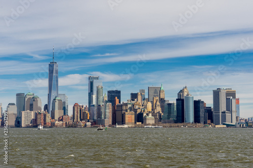 View of Manhattan downtown from ferry at daytime with cloud blue sky background. New York skyscrapers at Lower Manhattan, New York City, USA.