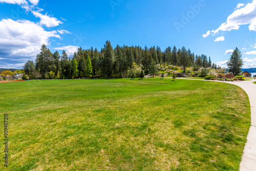 View of McEuen Park and Tubbs Hill, a 165 acre natural park bordering the lake and downtown resort area in Coeur d'Alene, Idaho USA.