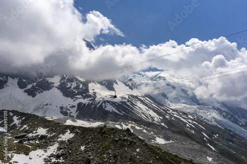 View of Mont Blanc massif and glacier in June. French Alps.