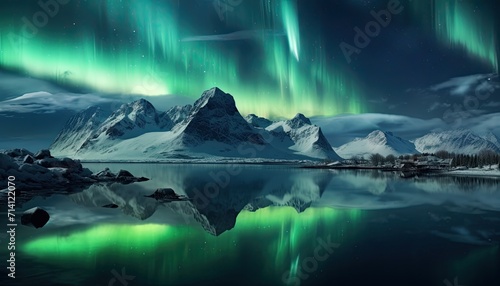View of night sky with multicolored aurora borealis and snowy mountains peak background. Night glows in vibrant aurora reflection on the lake with forest.