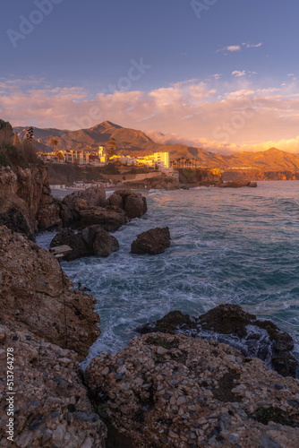 View of Parroquia El Salvador and coastline at sunset in Nerja, Nerja, Malaga Province, Andalucia