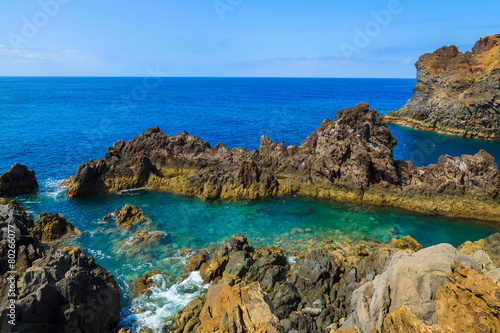 View of rocks on coast of Madeira island in Funchal, Portugal