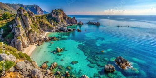 View of rugged rocky cliffs overlooking turquoise waters at Capo Vaticano beach in Calabria's Mediterranean coast , #rockycliffs, #cliffscapes