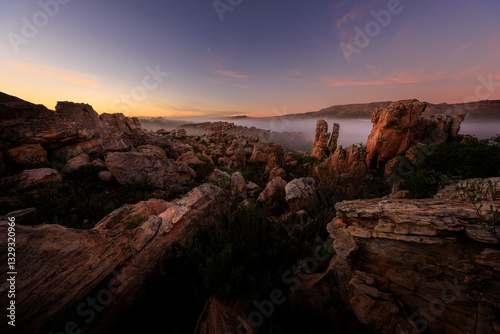 View of the beautiful Cederberg landscape under the Milky Way with dramatic rock formations, Valley of the Red Gods, Western Cape, South Africa.