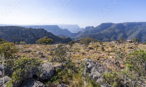 View of the Blyde River gorge, Lowveld Viewpoint, in the evening light, canyon landscape, Blyde River Canyon, Panorama Route, Mpumalanga, South Africa