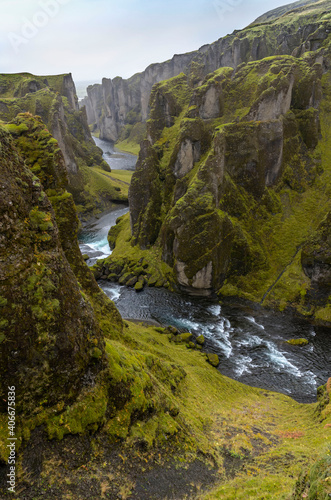 View of the cliffs and a river from above, Fjadrargljufur Canyon, Kirkjubaejarklaustur, Iceland