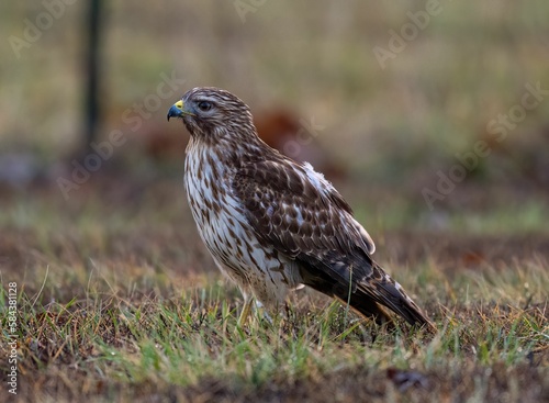 View of the hawk bird perched on the ground
