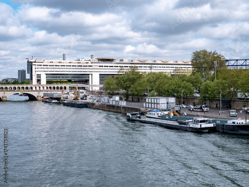 View of the right bank from Passerelle Simone-de-Beauvoir towards Pont de Bercy in Paris