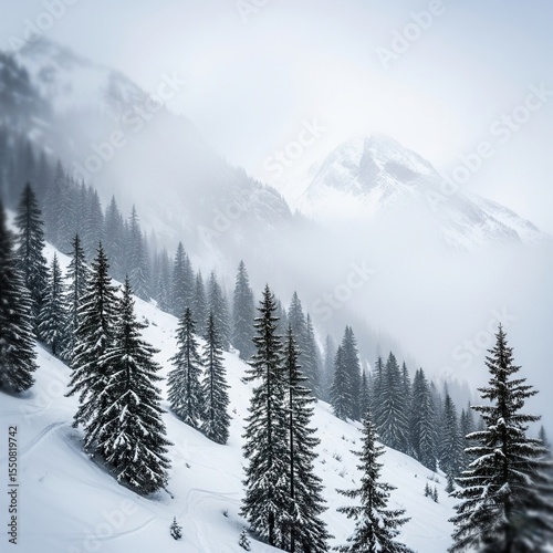 view of the slopes of the snow mountain with fog