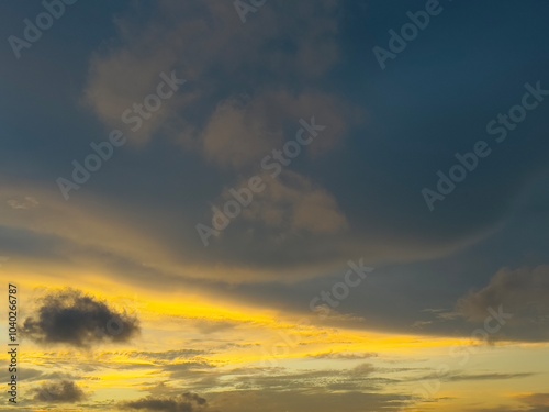 View of the twilight blue sky covered with clouds with dramatic light. Beautiful sky with cloud panorama sunset with golden orange clouds beautiful and amazing.